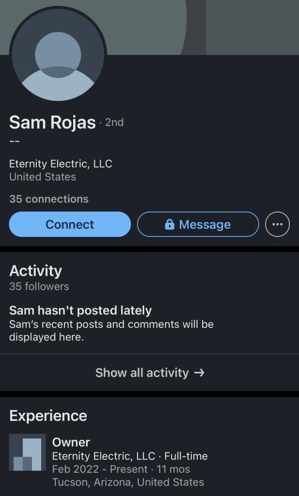 There is a business registered to this address called Eternity Electric, LLC that is owned by Samuel Rojas as documented by the BBB link below and screenshot of Samuel Rojas' LinkedIn profile as recently as February 2022, after the home was sold to Matthew Jonah Noriega and Tabernaculo. Side note: It is worth noting that the fact that Samuel Rojas has a LinkedIn profile indicates that he has access to the internet and possibly a smartphone, which are both prohibited by the Church Rules. However, due to his elevated position in the church and his high level of tithing, he may be able to get away with breaking these rules.