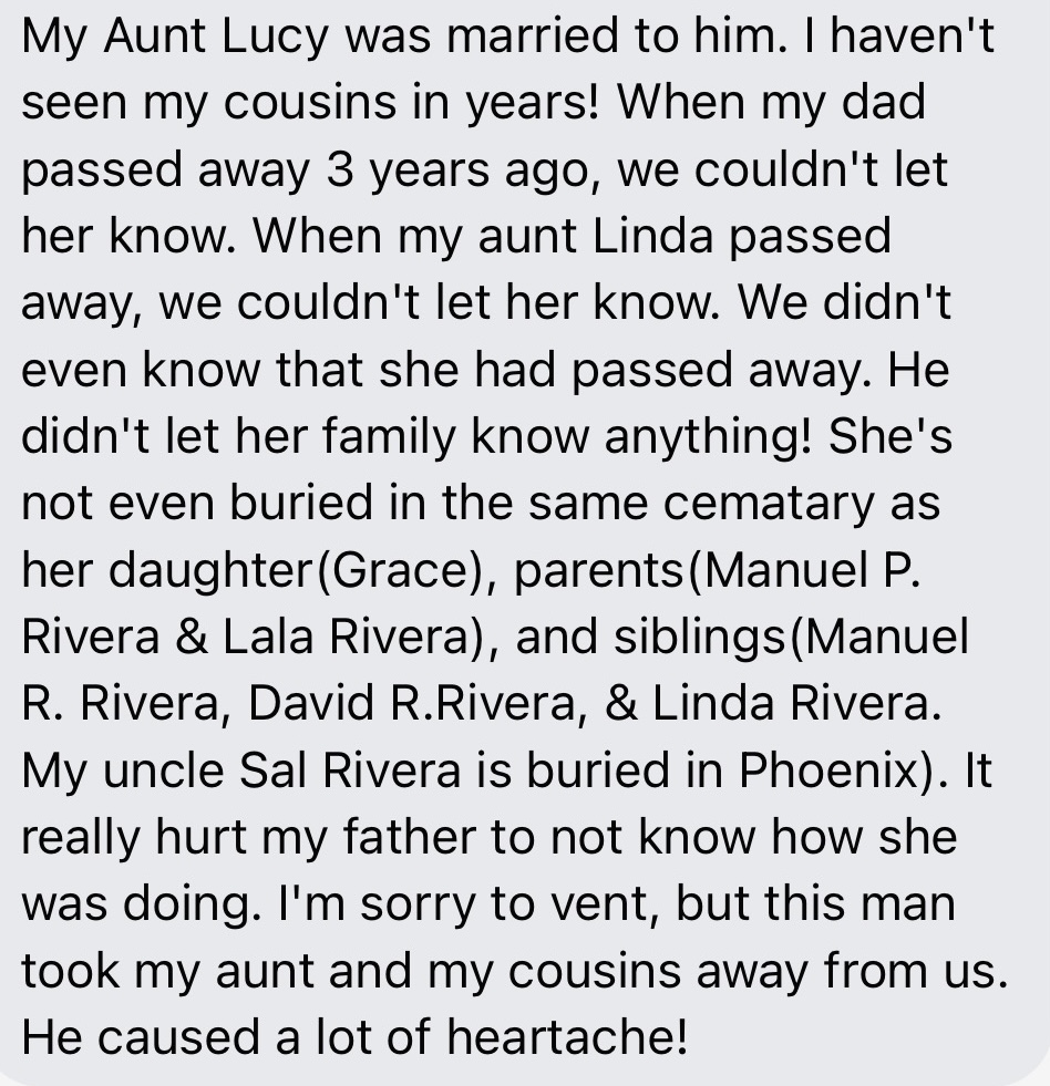 It's also come to our attention that relatives not affiliated with the church often discover a GDT family member's death much later, to their astonishment and upset. A notable instance involved the direct family of Lucy Rivera Noriega, who were unaware of her death until a significant time had passed. The "he/him" mentioned in these accounts refers to Isaac Noriega. These family members, already estranged, were further deprived of the chance to communicate their own losses within the family, highlighting a profound disconnection enforced by the church's policies.