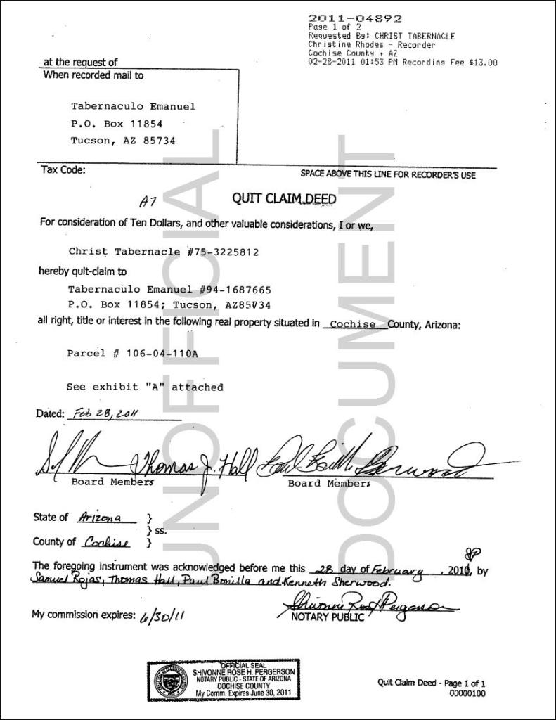 The Christ Tabernacle Properties were transferred over to Tabernaculo Emanuel on February 28, 2011. The Christ Tabernacle Church Trustees that signed off on this transaction were: Samuel Rojas (son of Danny & Andrea Rojas), Thomas Hall, Paul Bonilla and Kenneth Sherwood.