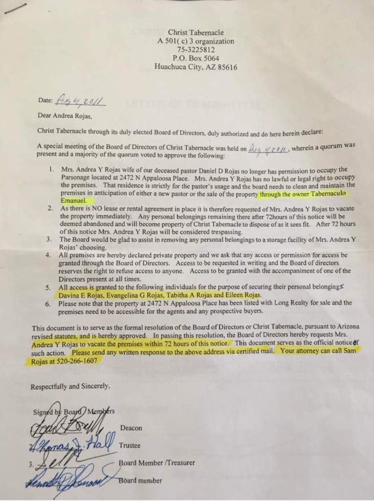 On August 4, 2011, Andrea Rojas was forced to leave the Christ Tabernacle Parsonage home, where she had resided for several years. This step was taken to urge her to relocate to Tucson along with the rest of the Rojas family. She was left with the harsh choices of either becoming homeless or moving to Tucson. The eviction letter from the Christ Tabernacle leadership can be found below, in which they threatened her with a 72-hour eviction, a move that raises legal concerns.